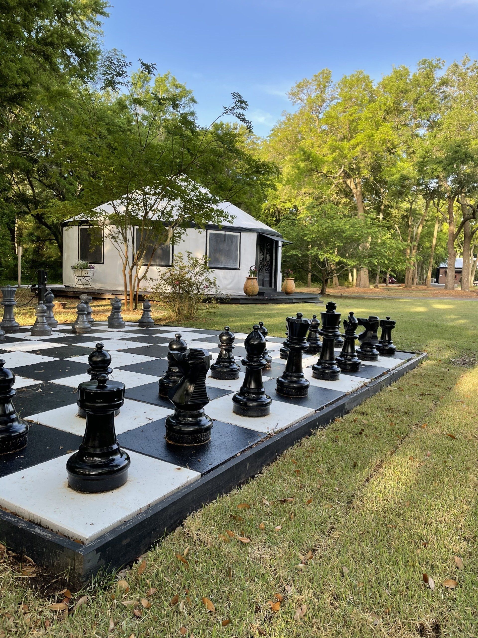 Oversized Chess Board, Corn Hole, Bocce Ball along with unique sitting areas
